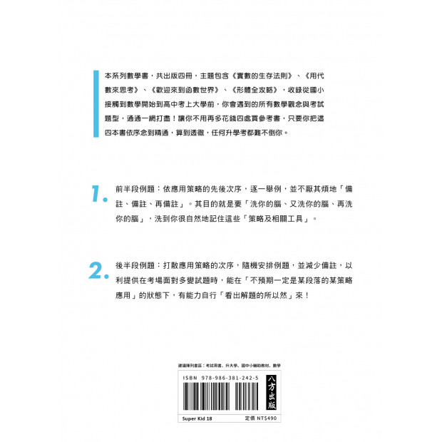 收錄從國小接觸到數學開始、一直到高中考上大學前所遇到的所有數學觀念與考試題型,通通一網打盡!讓你不用再多花錢四處買參考書,只要把這四本書依序念到精通、算到透徹,任何升學考都難不倒你!