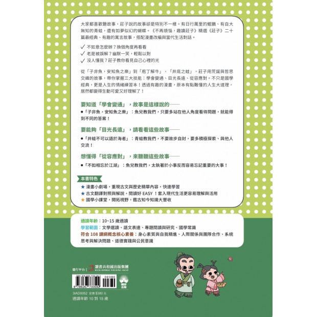 莊子邀請你一起進入一個奇幻的腦內宇宙。那裡的故事很自由,想像力可以飛來飛去,沒有人會說你想錯了。不過,我們平常在學校,已經習慣每個問題都要有一個正確的答案:「一就是一,二就是二。」